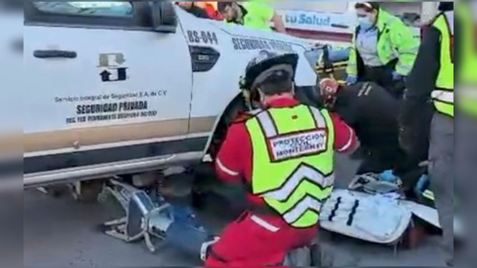 El hecho generó la movilización de cuerpos de emergencia al cruce de Alfonso Reyes con Río de la Plata y Río Tamesí, donde la víctima quedó atrapada bajo la parte frontal de una unidad perteneciente a una empresa de seguridad privada. Elementos de Protección Civil de Monterrey realizaron maniobras de rescate con equipo especializado para liberar a la mujer, quien posteriormente recibió atención médica por parte de paramédicos del Centro Regulador de Urgencias Médicas.
