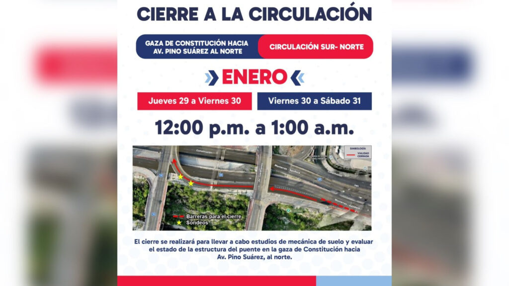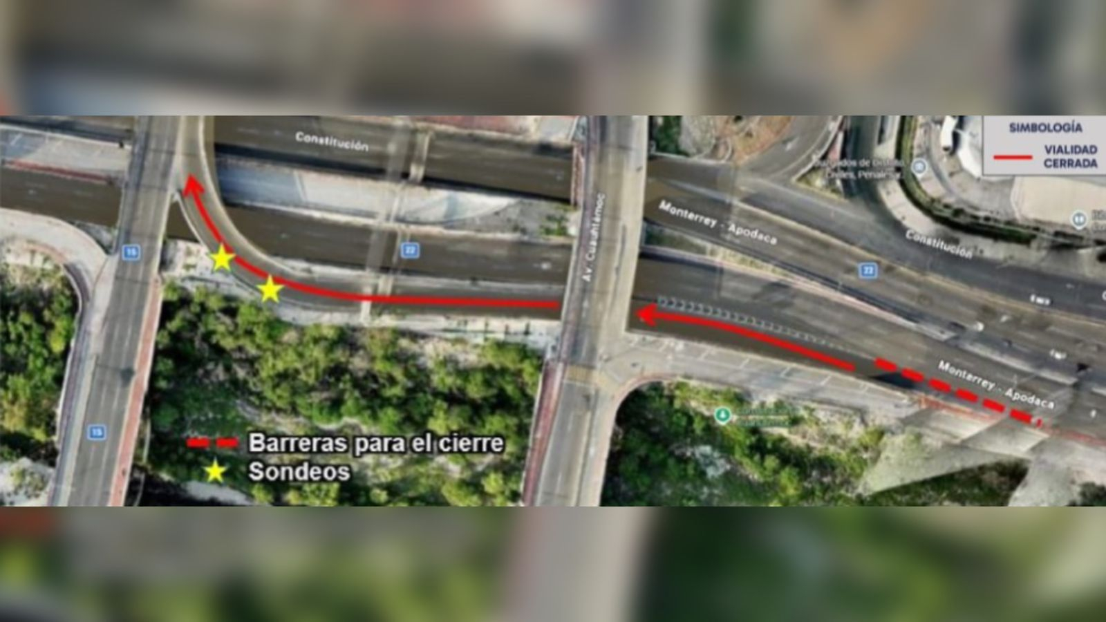 La Secretaría de Obras Públicas de Monterrey informó que el acceso que conecta la avenida Constitución con Pino Suárez en dirección norte estará cerrado parcialmente del 29 al 31 de enero, entre las 12:00 del día y la 1:00 de la madrugada, debido a trabajos técnicos y estudios de suelo.