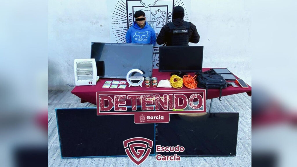 García, N.L.— Gracias a la implementación de la estrategia de seguridad “Escudo García”, elementos de la policía municipal lograron la captura de un hombre señalado por el robo a una casa habitación en este municipio. Al momento de su detención, al sospechoso le fueron asegurados diversos artículos que presuntamente acababa de sustraer de un domicilio, entre los que destacaban tres pantallas de televisión, tabletas digitales, teléfonos celulares, un calentador eléctrico, además de otros objetos de valor.