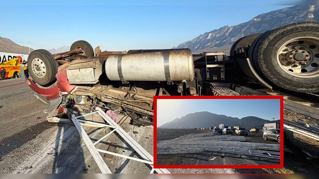 Santa Catarina, N.L. — Un transporte de carga pesada que trasladaba vigas de acero protagonizó una volcadura mientras circulaba por la carretera Monterrey–Saltillo. El incidente ocurrió específicamente a la altura del kilómetro 53 en el sentido hacia Nuevo León, lo que provocó el despliegue inmediato de las autoridades estatales para atender la emergencia.